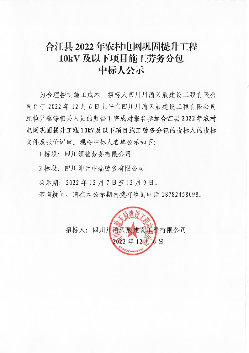合江县2022年农村电网巩固提升工程10kV及以下项目施工劳务分包中标人公示