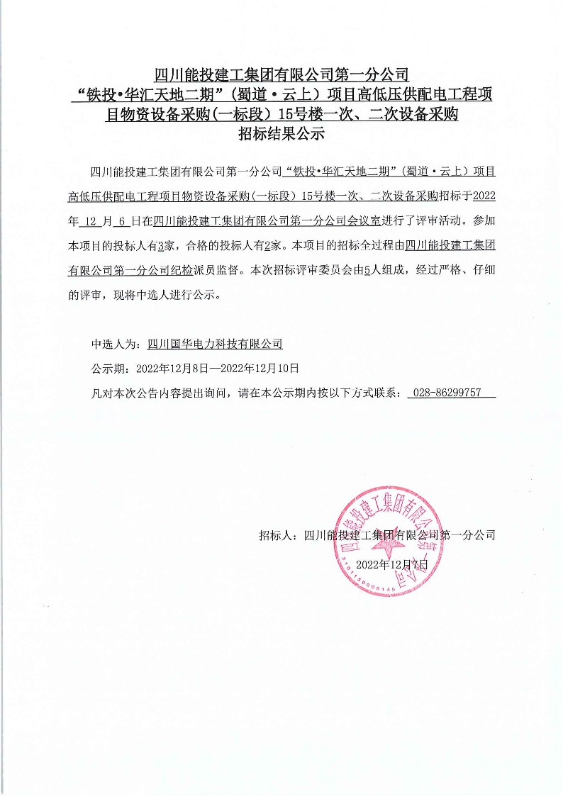 铁投.华汇二期(蜀道.云上)项目高低压供配电工程项目物资设备采购(一标段)15号楼一次、二次设备采购招标结果公示