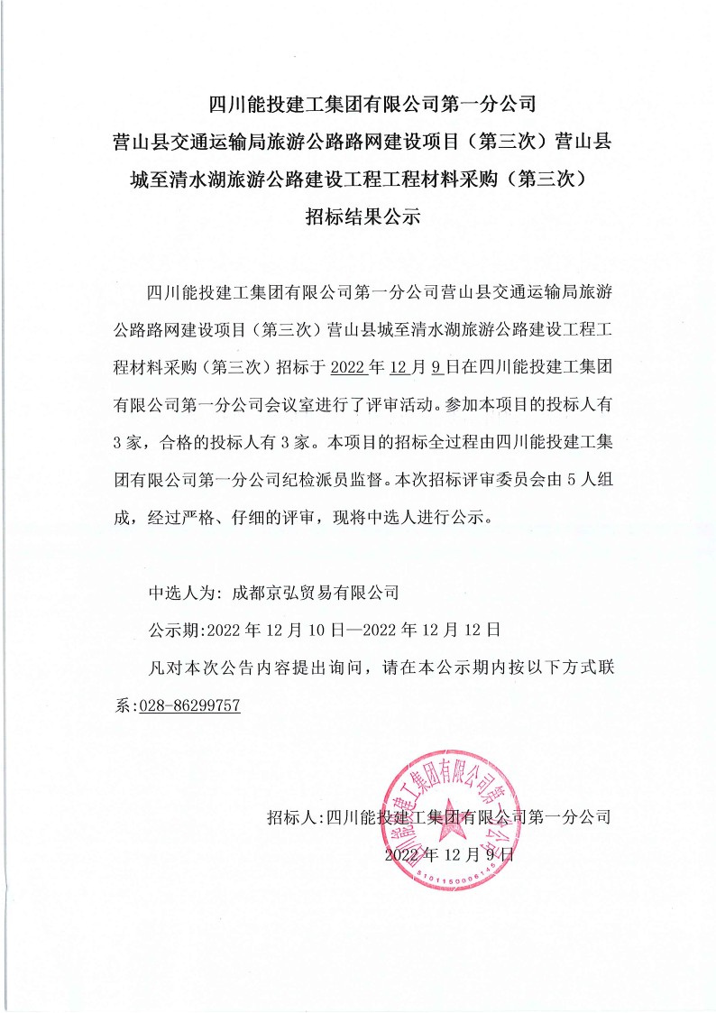 营山县城至清水湖旅游公路建设工程工程材料采购(第三次)招标结果公示