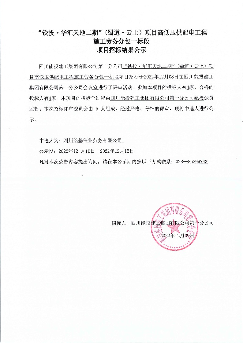 下一条:“铁投·华汇天地二期”(蜀道·云上)项目高低压供配电工程施工劳务分包三标段项目招标结果公示