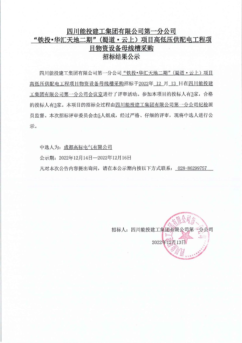 “铁投·华汇天地二期”(蜀道·云上)项目高低压供配电工程项目物资设备母线槽采购结果公示