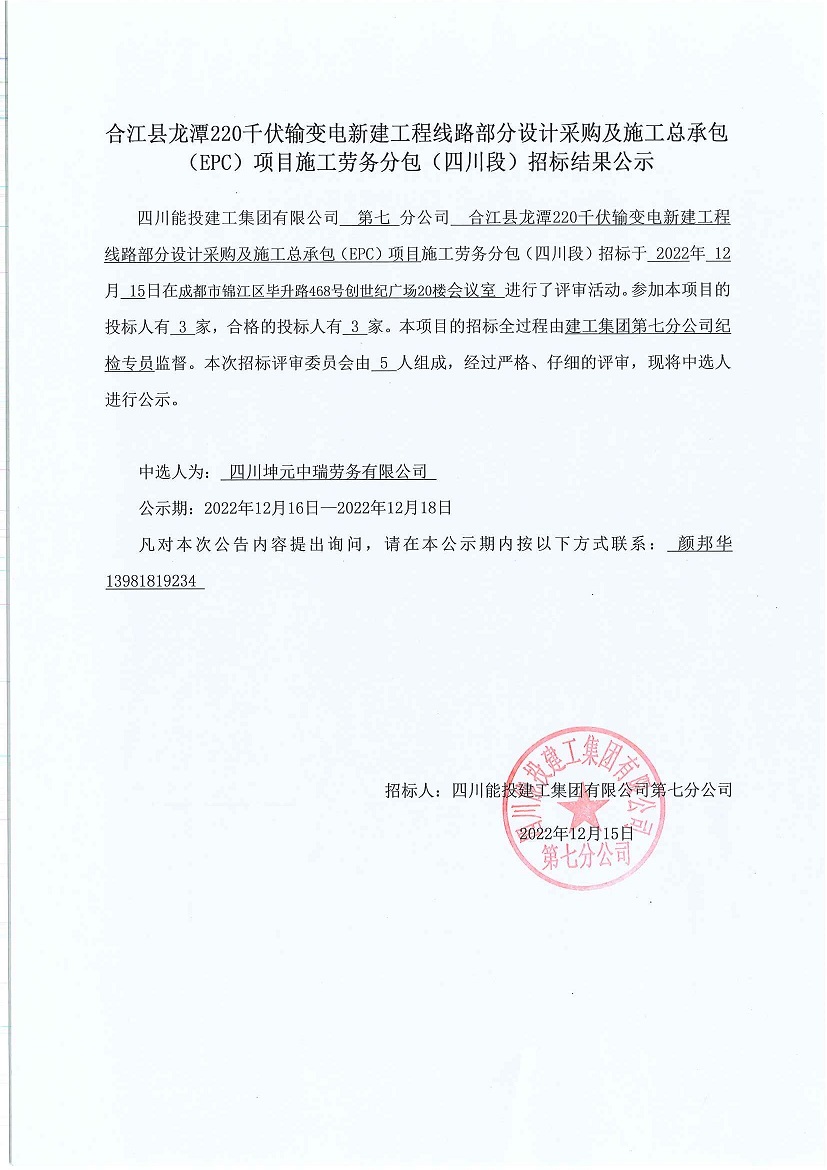 合江县龙潭220千伏输变电新建工程线路部分设计采购及施工总承包(EPC)项目施工劳务分包(四川段)招标结果公示