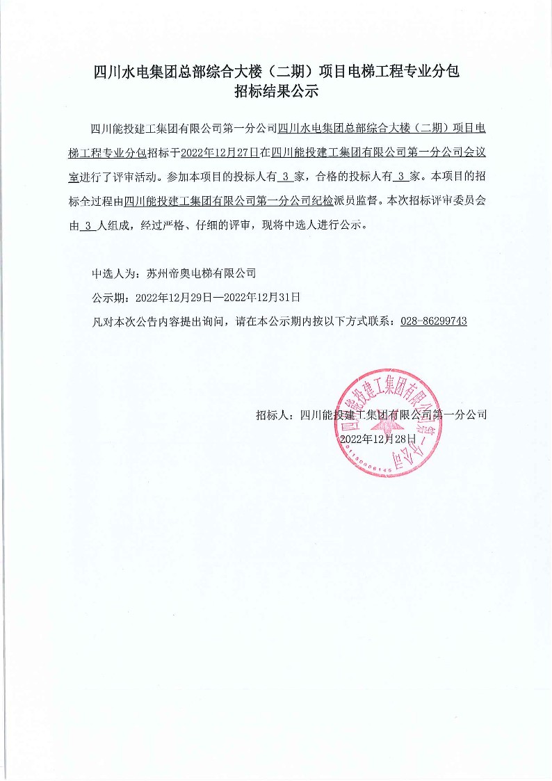 四川水电集团总部综合大楼(二期)项目电梯工程专业分包招标结果公示