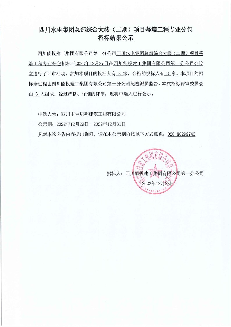 四川水电集团总部综合大楼(二期)项目幕墙工程专业分包招标结果公示