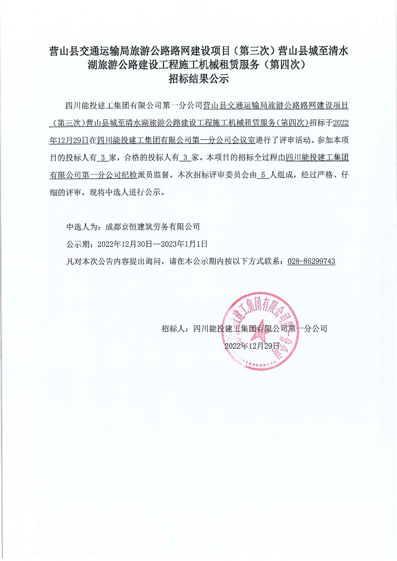 营山县城至清水湖旅游公路建设工程施工机械租赁服务(第四次)招标结果公示
