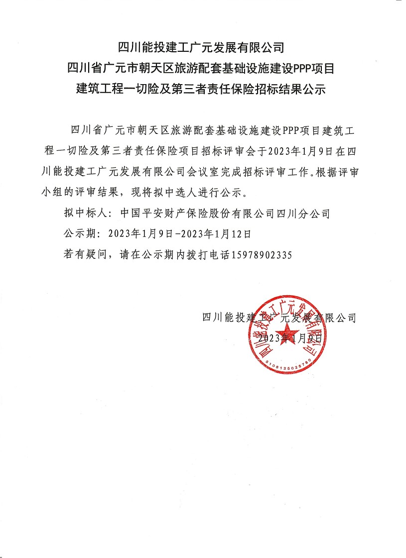 四川省广元市朝天区旅游配套基础设施建设PPP项目建筑工程一切险及第三者责任保险招标结果公示