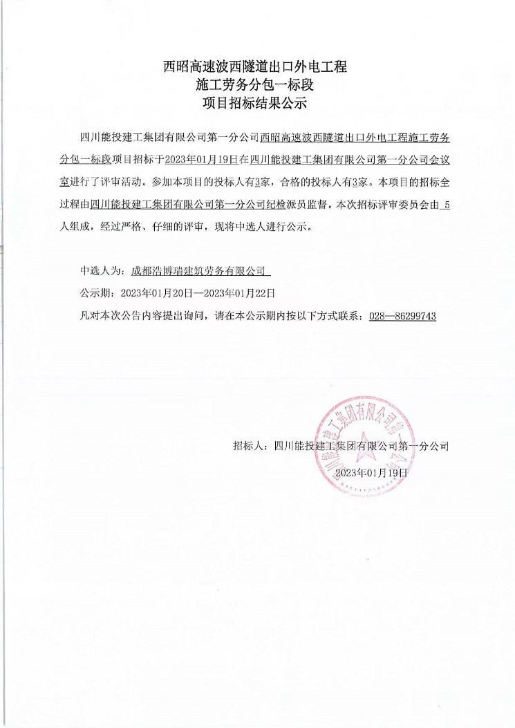 西昭高速波西隧道出口外电工程施工劳务分包二标段结果公示
