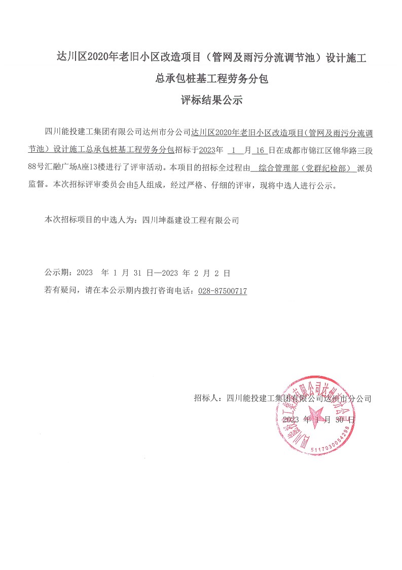 达川区2020年老旧小区改造项目(管网及雨污分流调节池)设计施工总承包桩基工程劳务分包结果公示