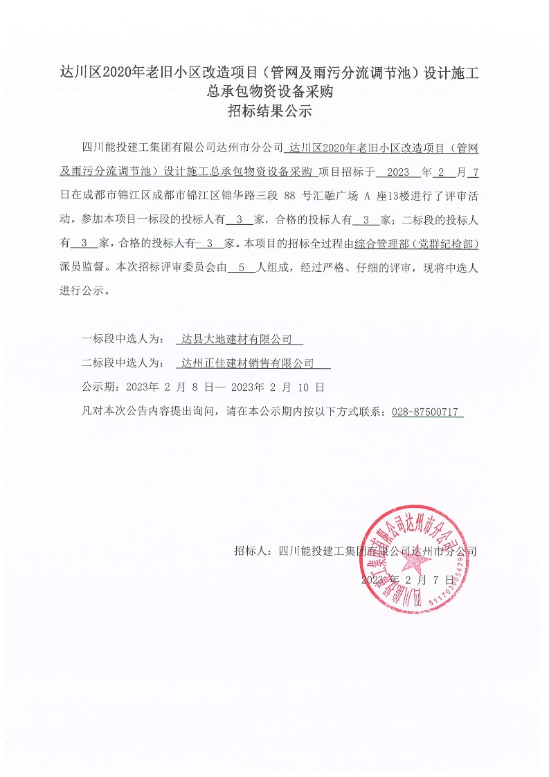 上一条:达川区2020年老旧小区改造项目(管网及雨污分流调节池)设计施工总承包第二批次物资设备采购招标结果公示