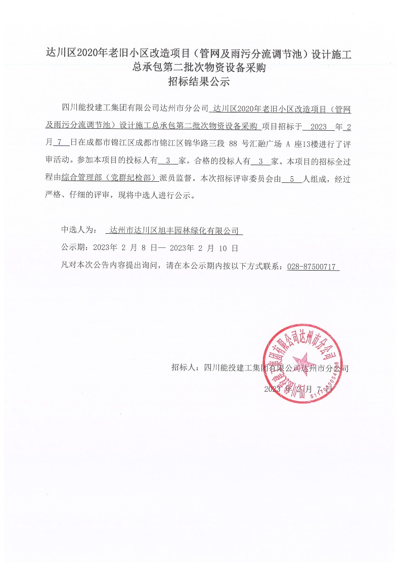 达川区2020年老旧小区改造项目(管网及雨污分流调节池)设计施工总承包第二批次物资设备采购招标结果公示