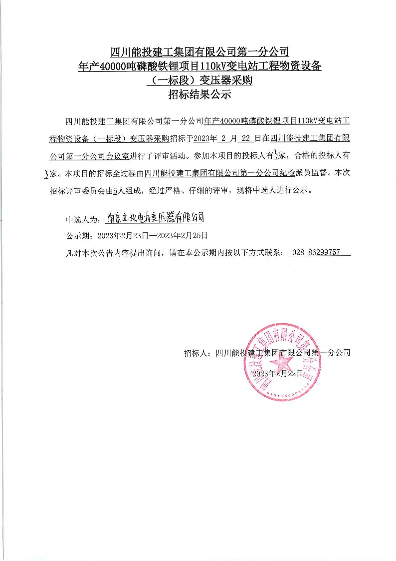 年产40000吨磷酸铁锂项目110kV变电站工程物资设备(一标段)变压器采购结果公示