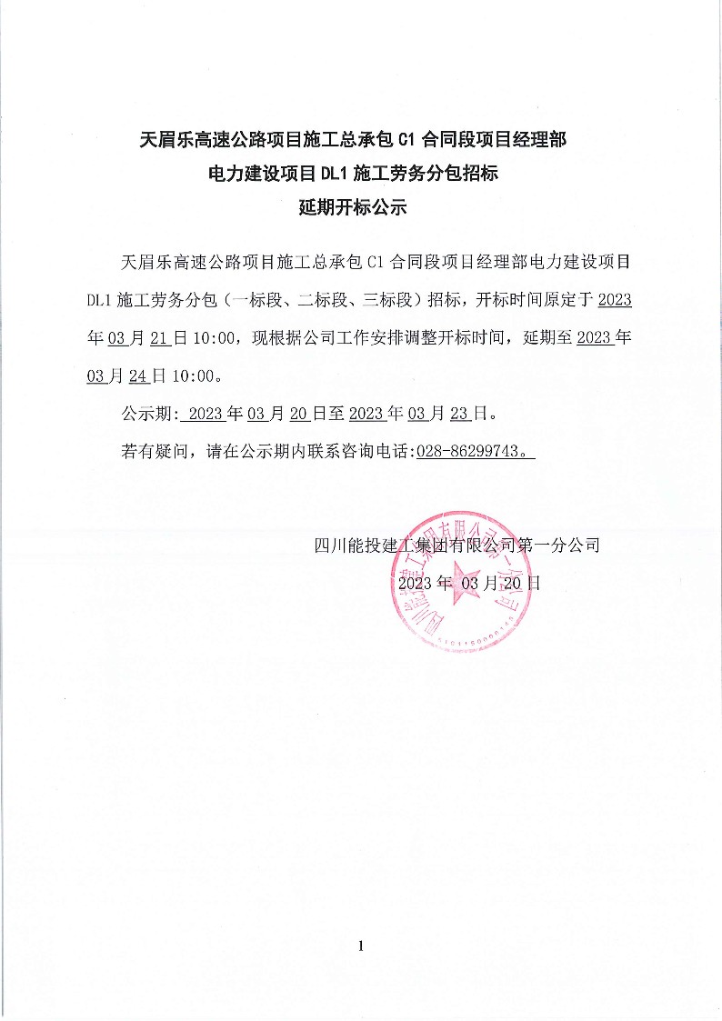天眉乐高速公路项目施工总承包C1合同段项目经理部电力建设项目DL1施工劳务分包招标延期开标公示