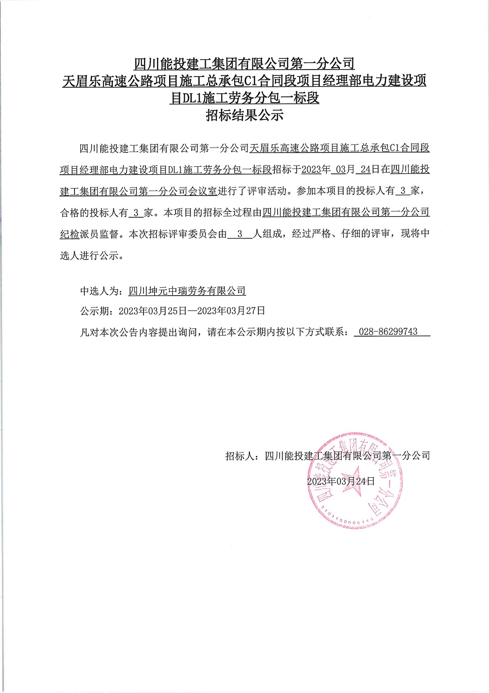 天眉乐高速公路项目施工总承包C1合同段项目经理部电力建设项目DL1施工劳务分包一标段招标结果公示
