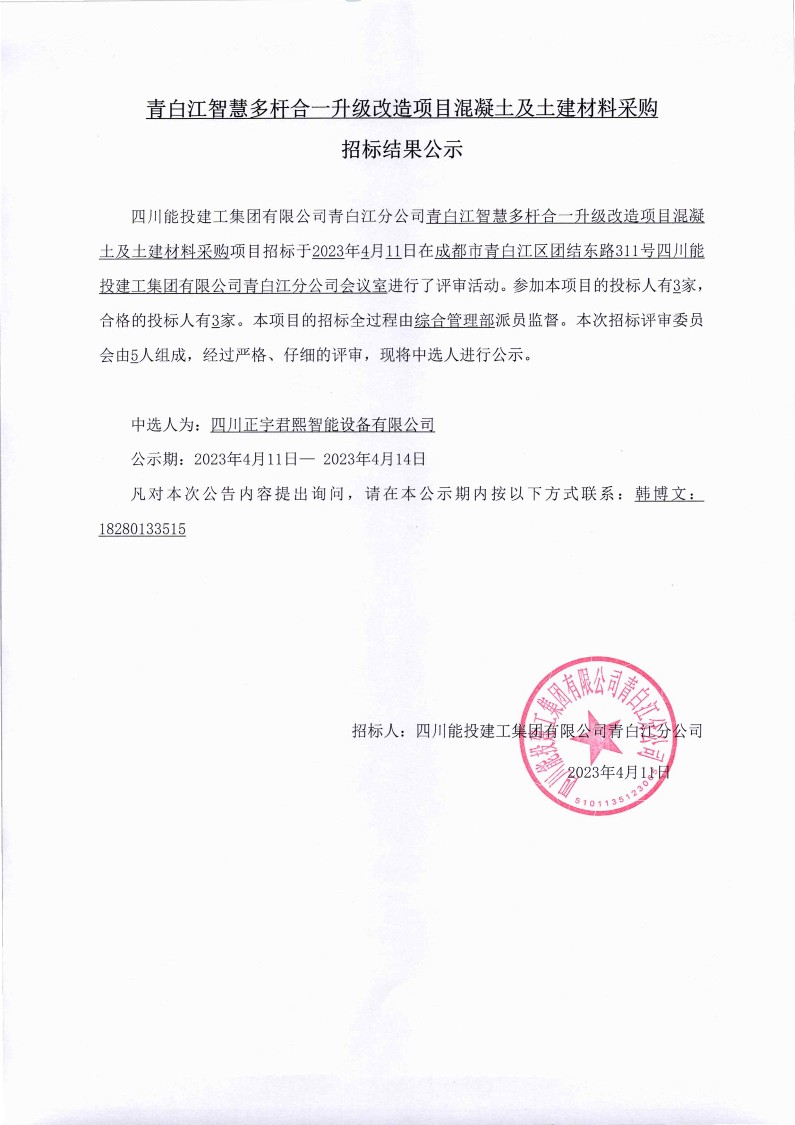 青白江智慧多杆合一升级改造项目混凝土及土建材料采购招标结果公示
