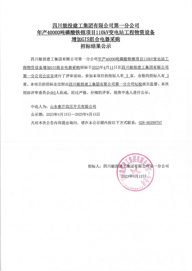 年产40000吨磷酸铁锂项目110kV变电站工程物资设备增加GIS组合电器招标结果公示