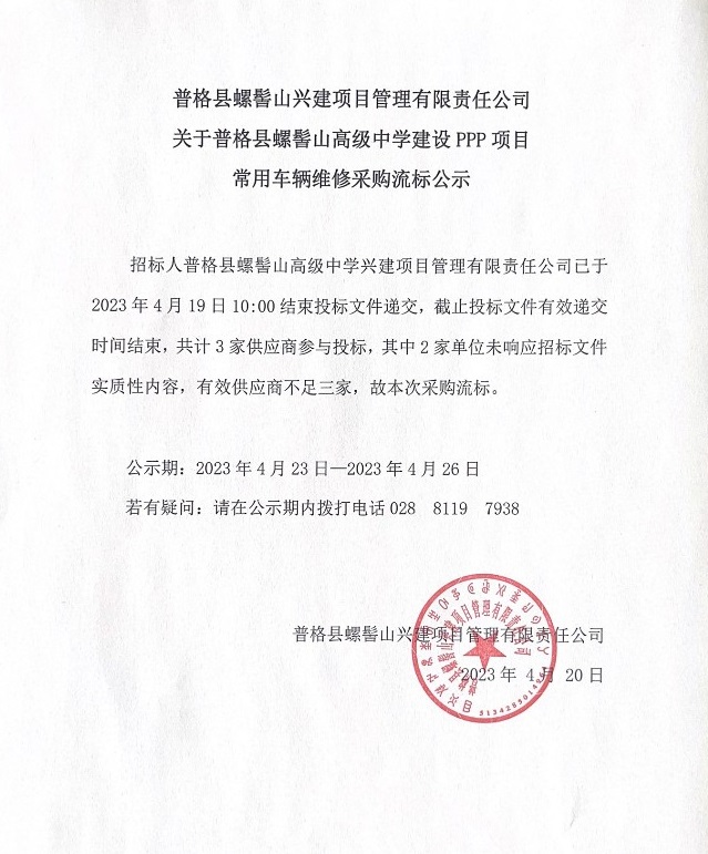 关于普格县螺髻山高级中学建设PPP项目常用车辆维修采购流标公示