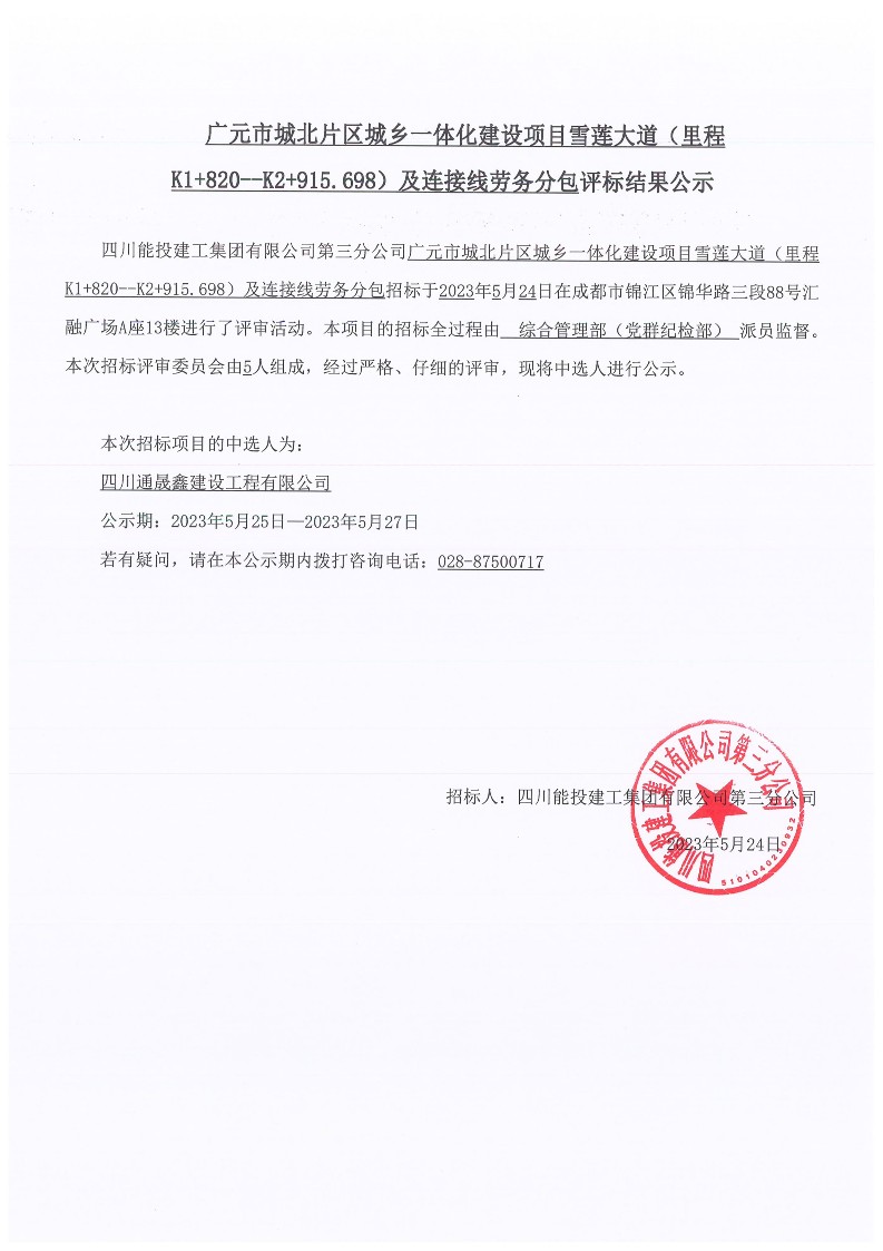 广元市城北片区城乡一体化建设项目雪莲大道(里程K1+820-K2+915.698)及连接线劳务分包结果公示