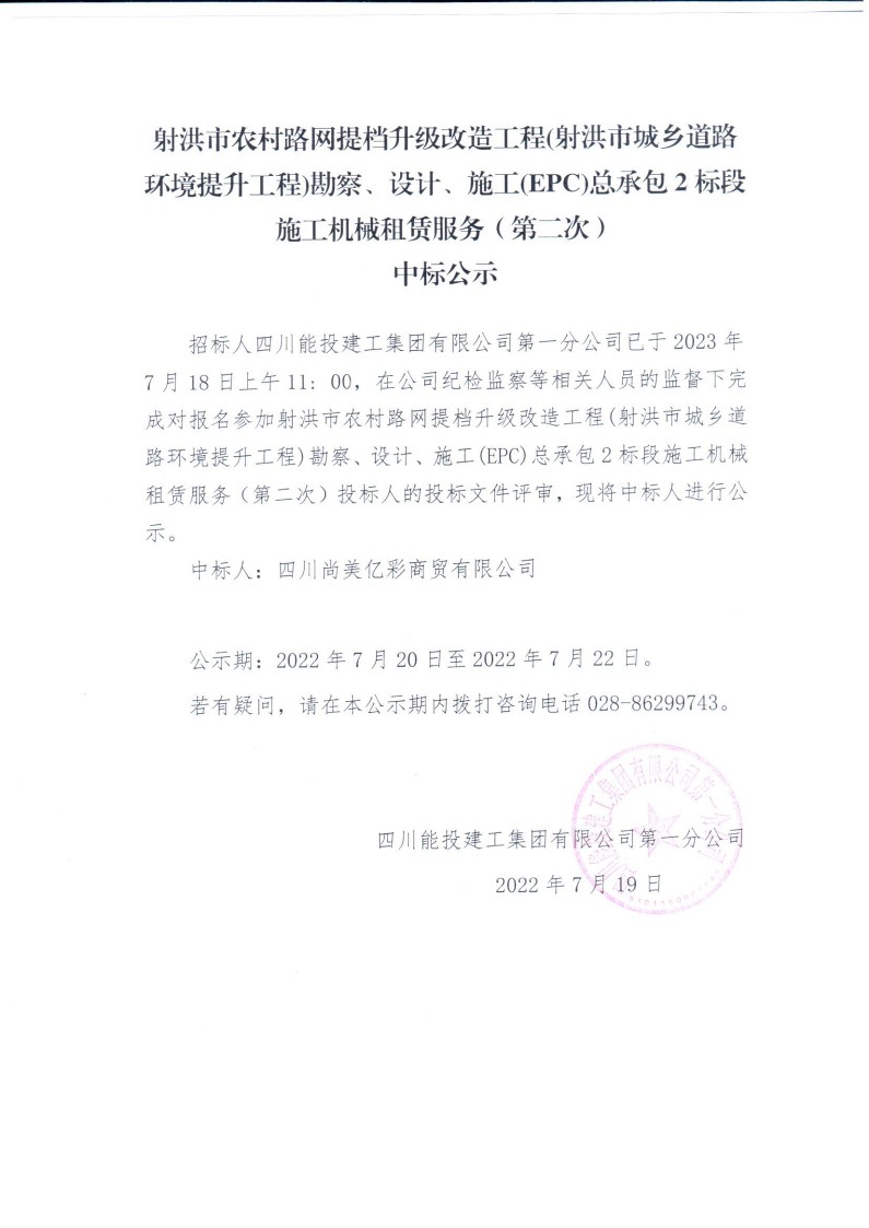 上一条:射洪市农村路网提档升级改造工程(射洪市城乡道路环境提升工程)勘察、设计、施工(EPC)总承包2标段施工劳务分包一标段(第二次)中标公示