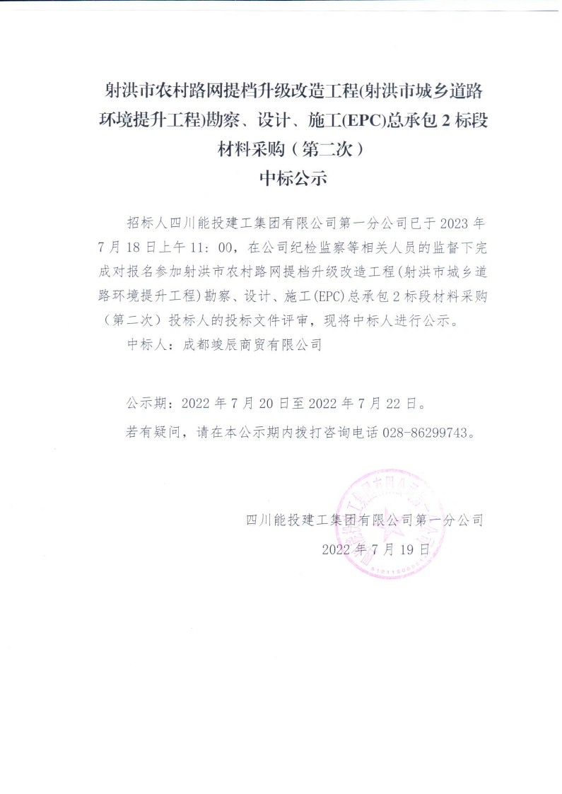 下一条:射洪市农村路网提档升级改造工程(射洪市城乡道路环境提升工程)勘察、设计、施工(EPC)总承包2标段施工劳务分包一标段(第二次)中标公示