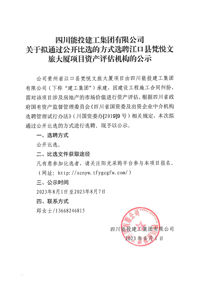 关于拟通过公开比选的方式选聘江口县梵悦文旅大厦项目资产评估机构的公示