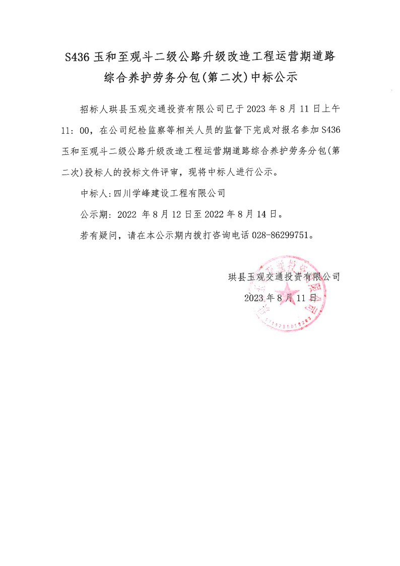 S436玉和至观斗二级公路升级改造工程运营期道路综合养护劳务分包(第二次)中标公示