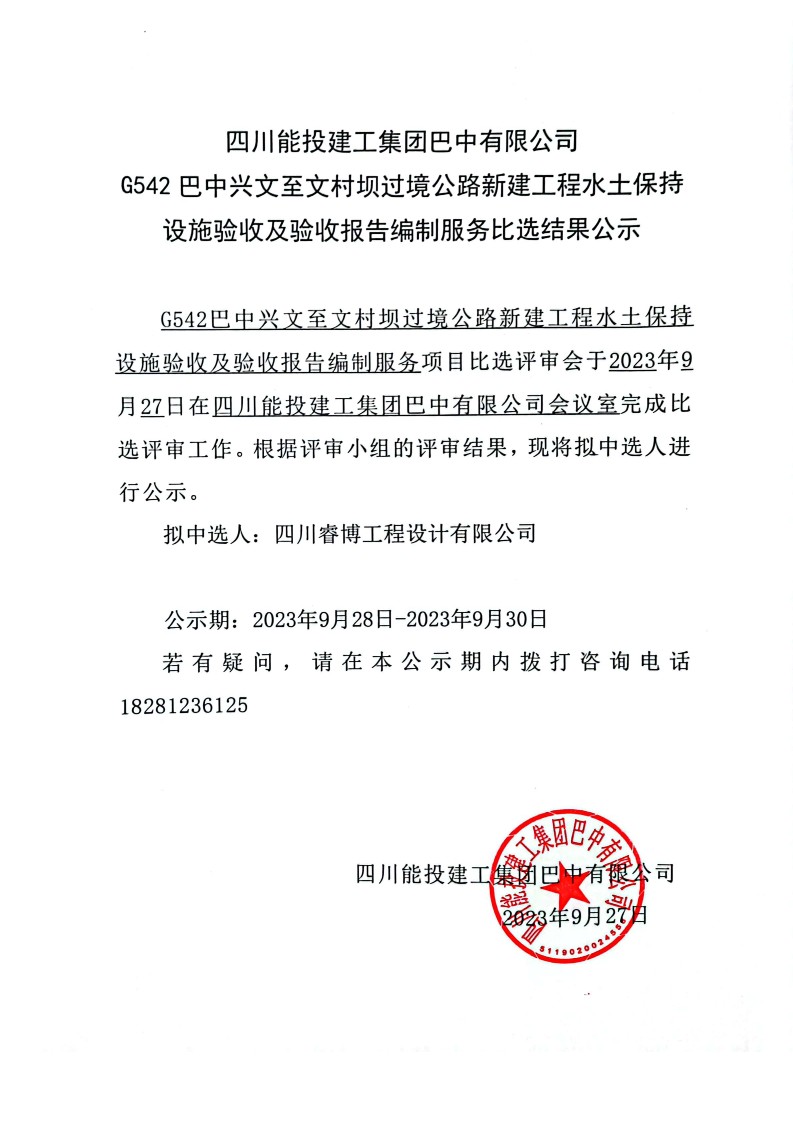 G542巴中兴文至文村坝过境公路新建工程水土保持设施验收及验收报告编制服务结果公示