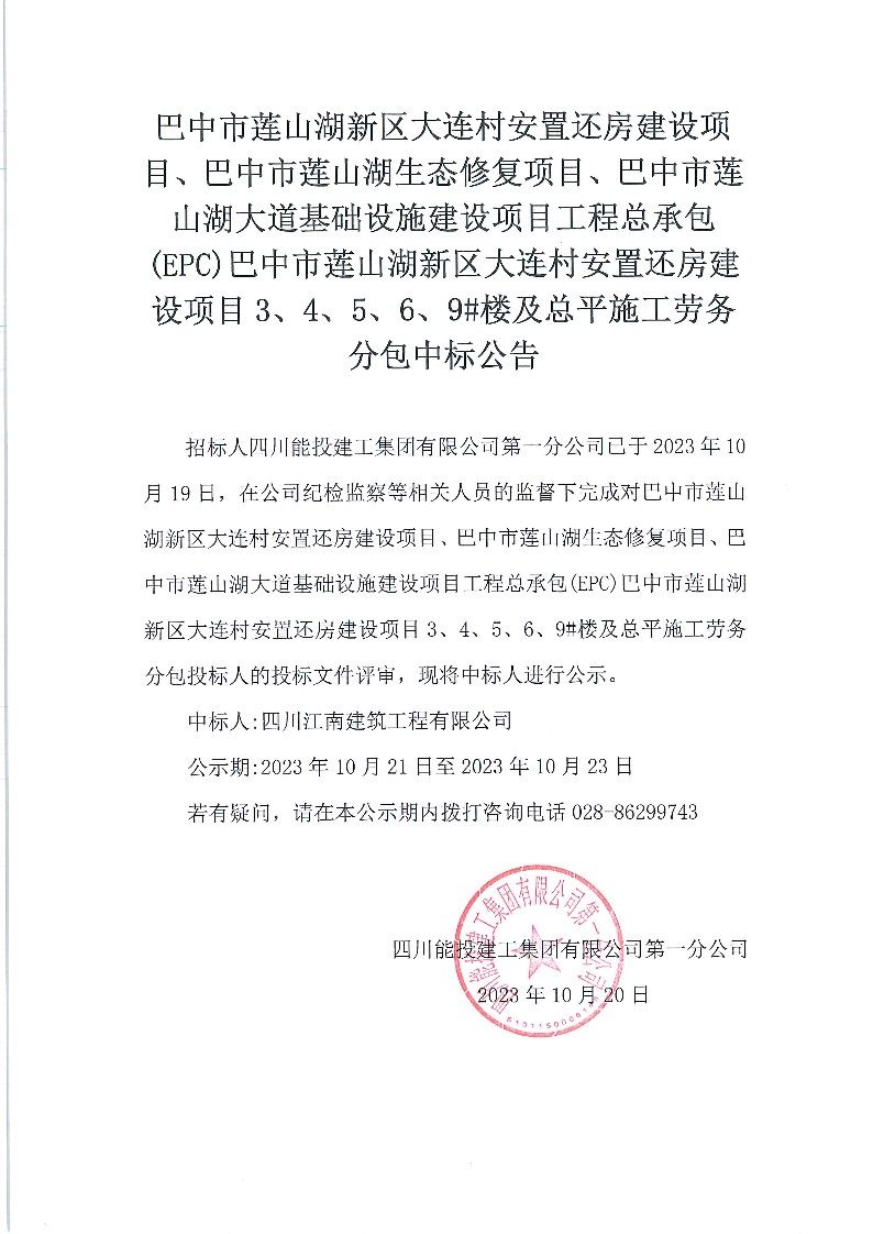 巴中市莲山湖新区大连村安置还房建设项目3、4、5、6、9#楼及总平施工劳务分包中标公告