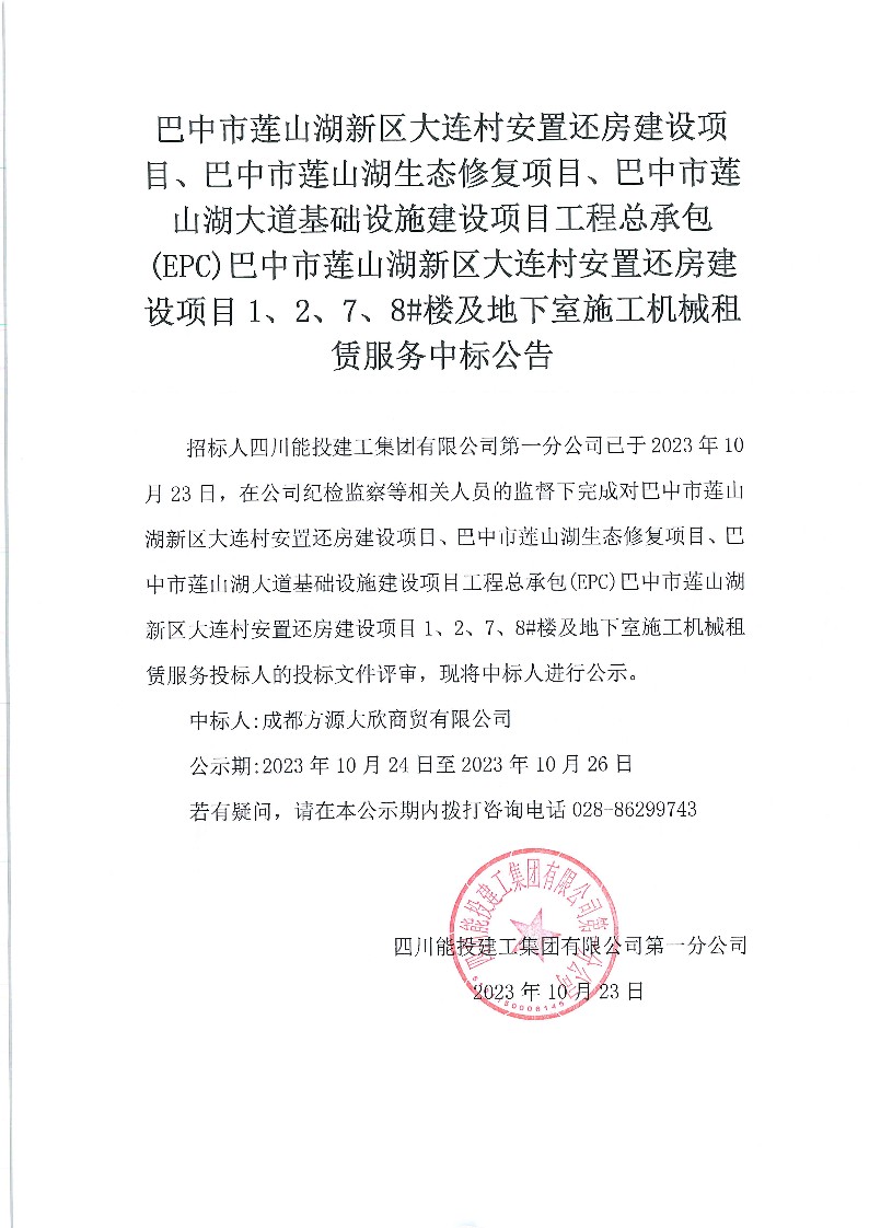 巴中市莲山湖新区大连村安置还房建设项目1、2、7、8#楼及地下室施工机械租赁服务中标公告
