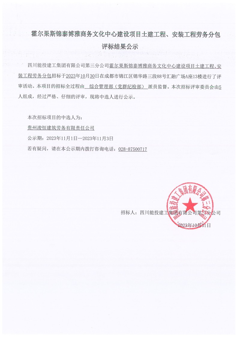 霍尔果斯锦泰博雅商务文化中心建设项目土建工程、安装工程劳务分包结果公示