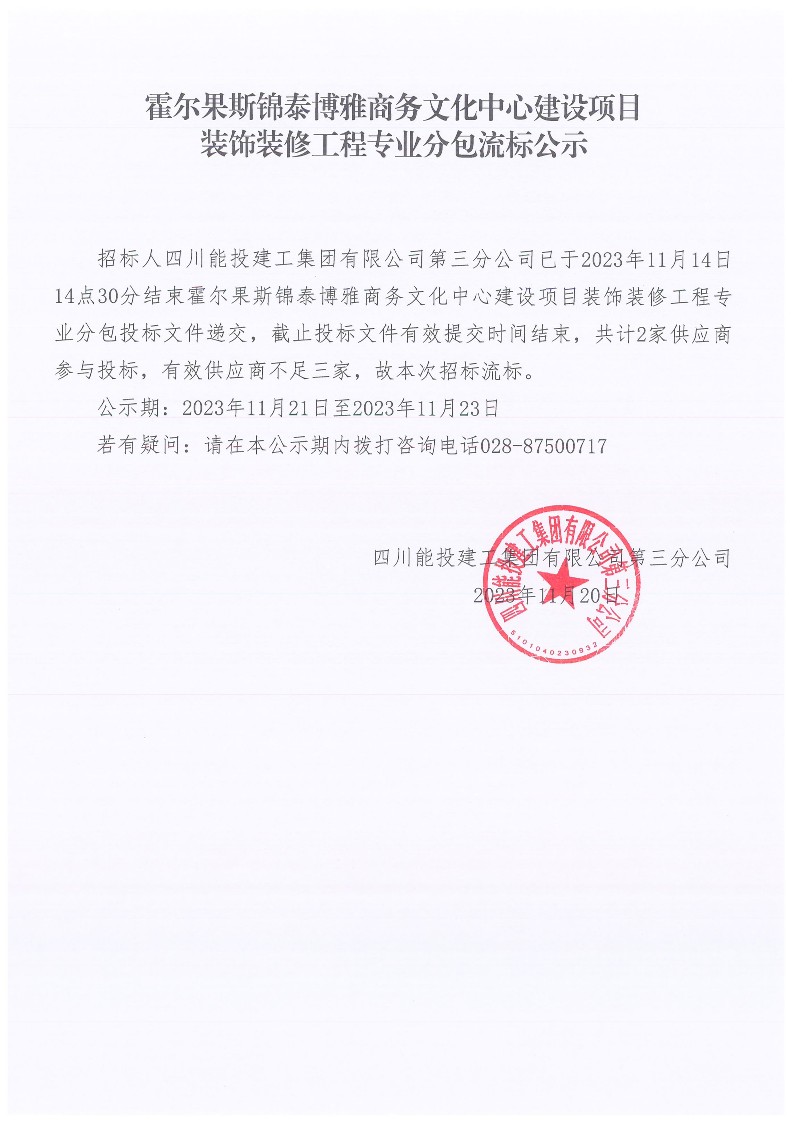 霍尔果斯锦泰博雅商务文化中心建设项目装饰装修工程专业分包流标公示