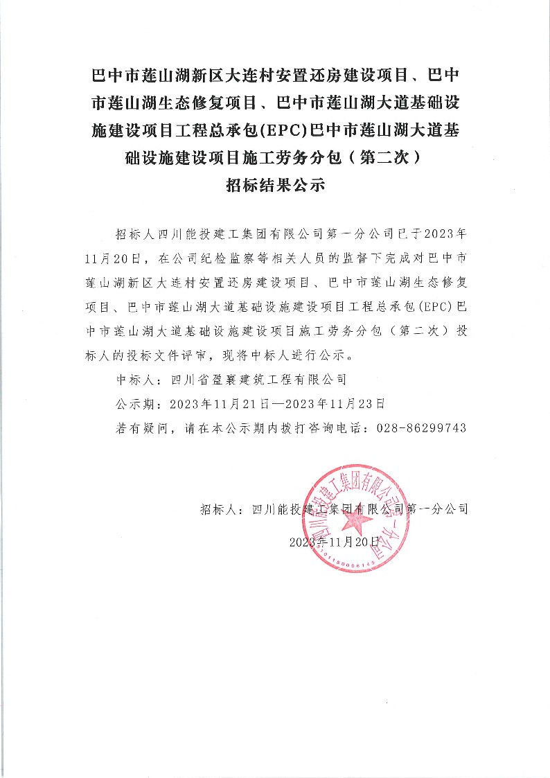 巴中市莲山湖大道基础设施建设项目施工劳务分包(第二次)结果公示
