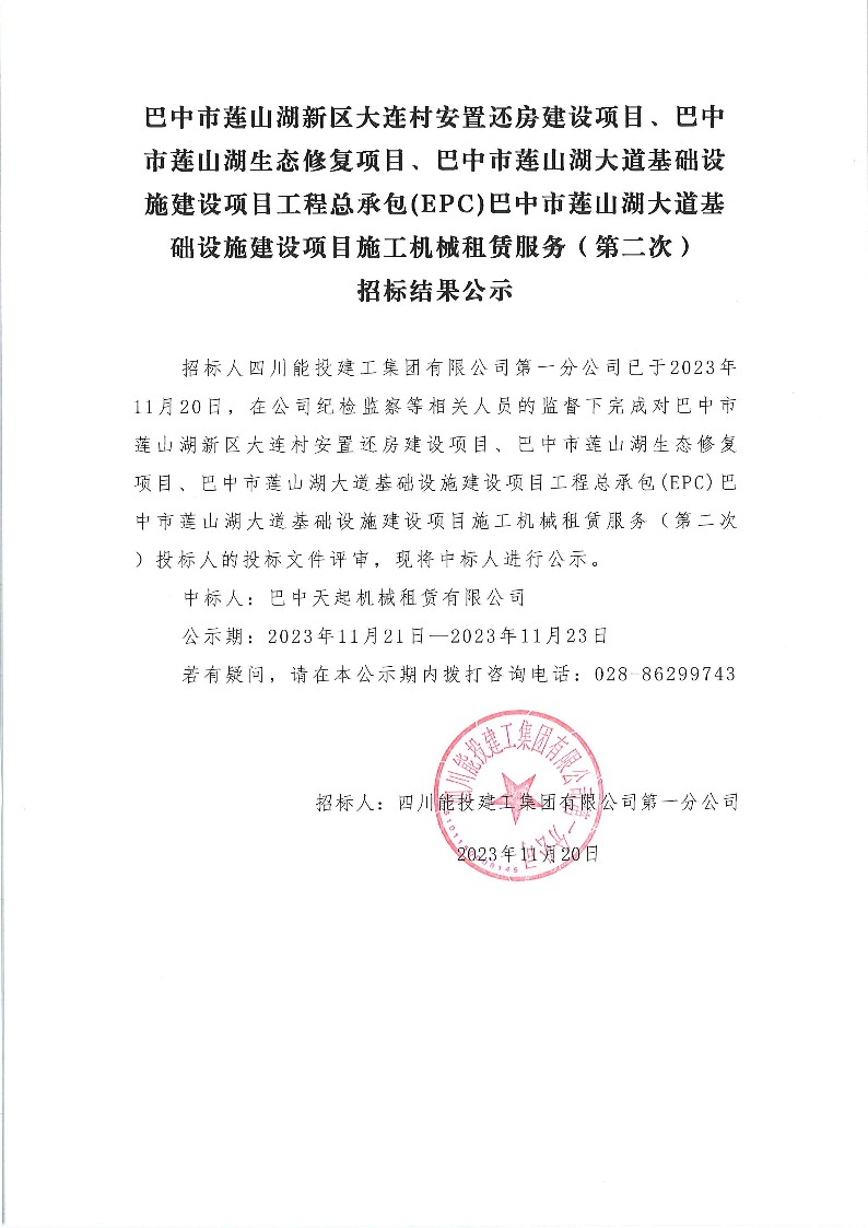 巴中市莲山湖大道基础设施建设项目施工机械租赁服务(第二次)结果公示