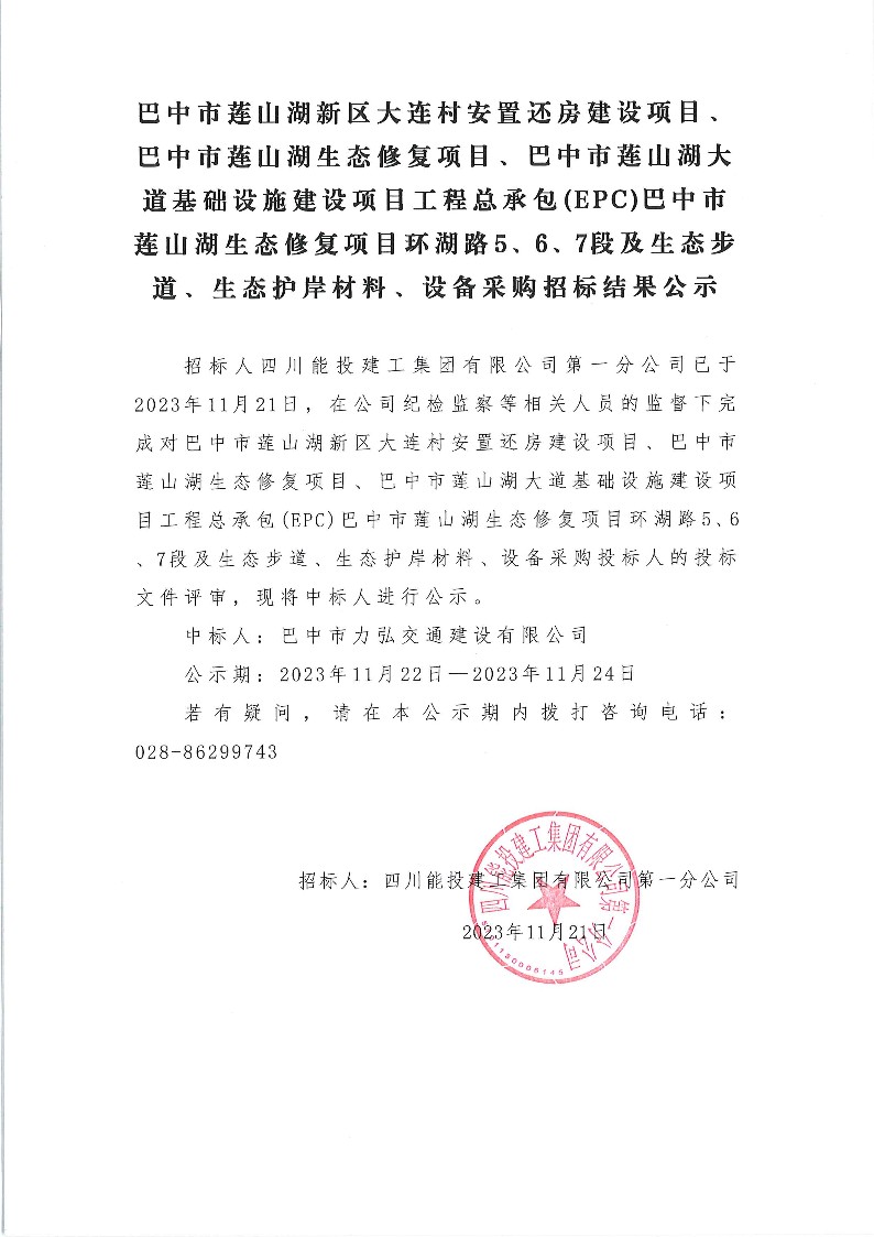 巴中市莲山湖生态修复项目环湖路5、6、7段及生态步道、生态护岸材料、设备采购招标结果公示
