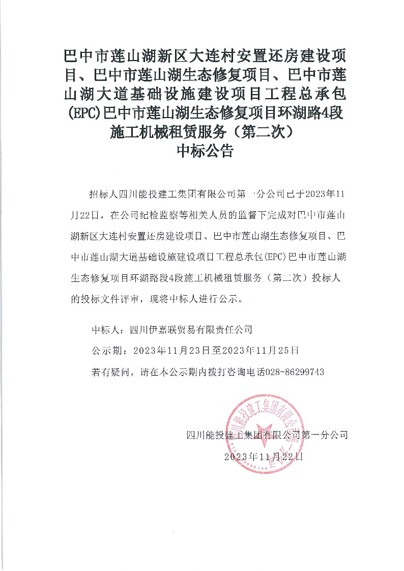 巴中市莲山湖生态修复项目环湖路4段施工机械租赁服务(第二次)中标公告