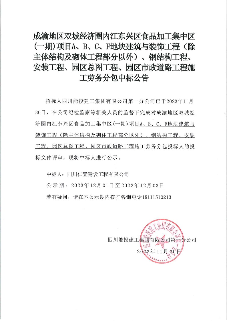 上一条:成渝地区双城经济圈内江东兴区食品加工集中区(一期)项目ABCF地块建筑与装饰工程、钢结构工程、安装工程、园区总图工程、园区市政道路工程材料、设备采购流标公告