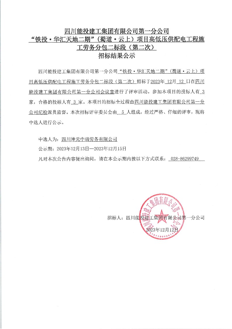 上一条:“铁投·华汇天地二期”(蜀道·云上)项目高低压供配电工程施工劳务分包一标段(第二次)结果公示