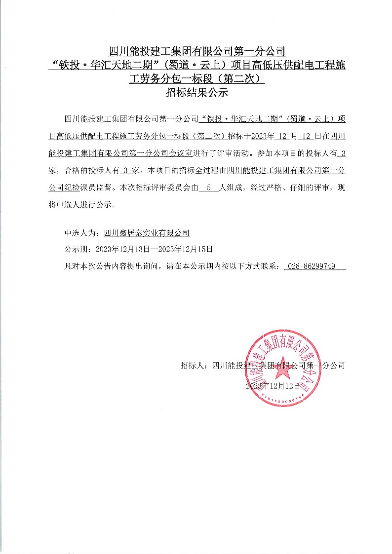 下一条:“铁投·华汇天地二期”(蜀道·云上)项目高低压供配电工程施工劳务分包二标段(第二次)结果公示