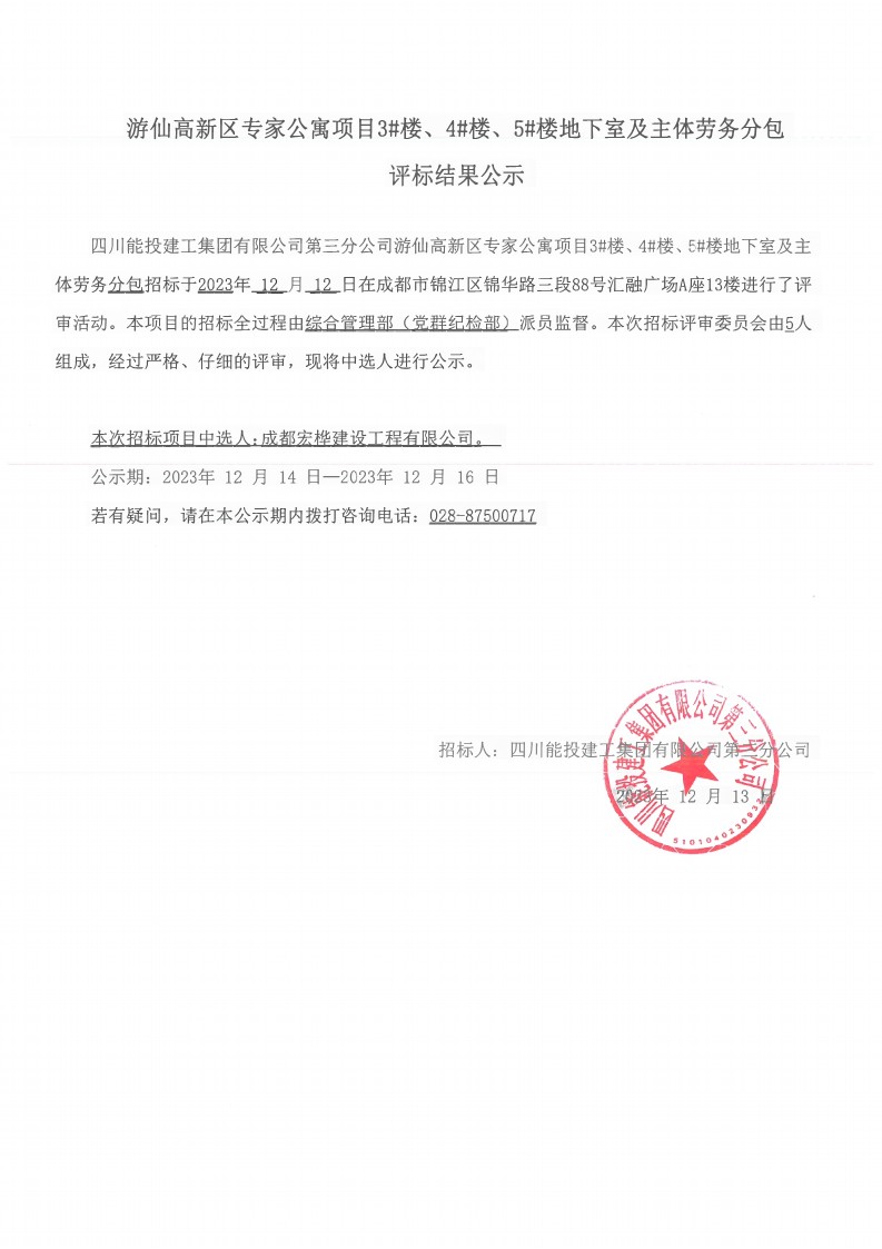 游仙高新区专家公寓项目3#楼、4#楼、5#楼地下室及主体劳务分包结果公示