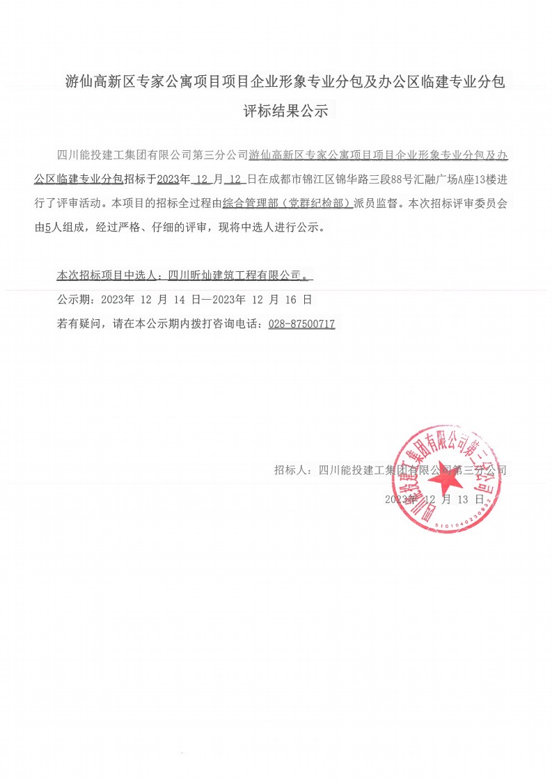 游仙高新区专家公寓项目项目企业形象专业分包及办公区临建专业分包结果公示