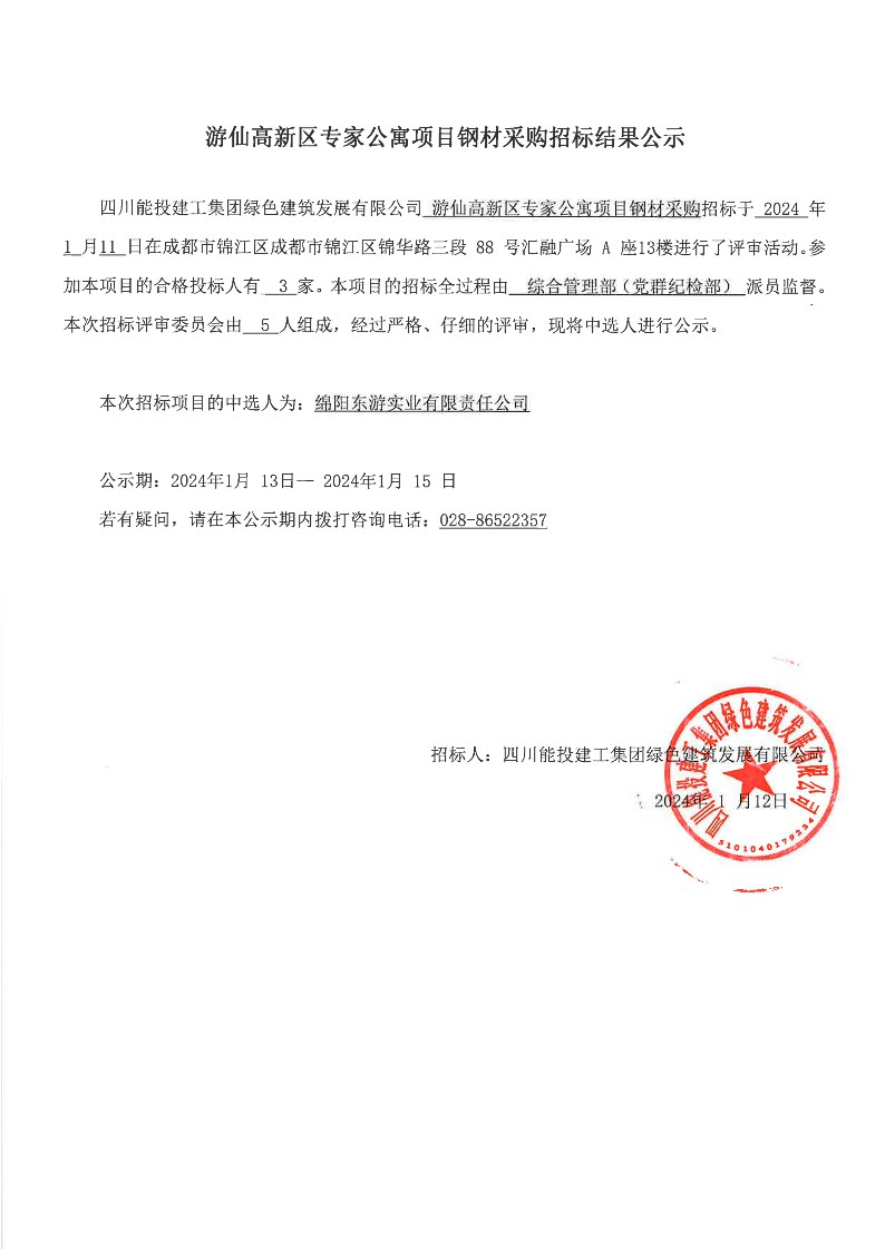 游仙高新区专家公寓项目钢材采购招标结果公示
