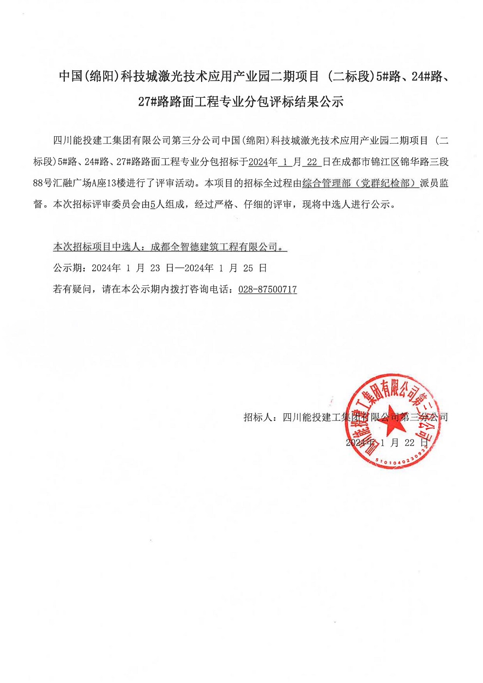 中国(绵阳)科技城激光技术应用产业园二期项目(二标段)5#路、24#路、27#路路面工程专业分包结果公示