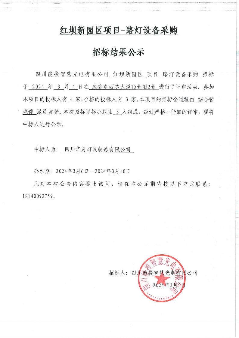 红坝新园区项目路灯设备采购结果公示