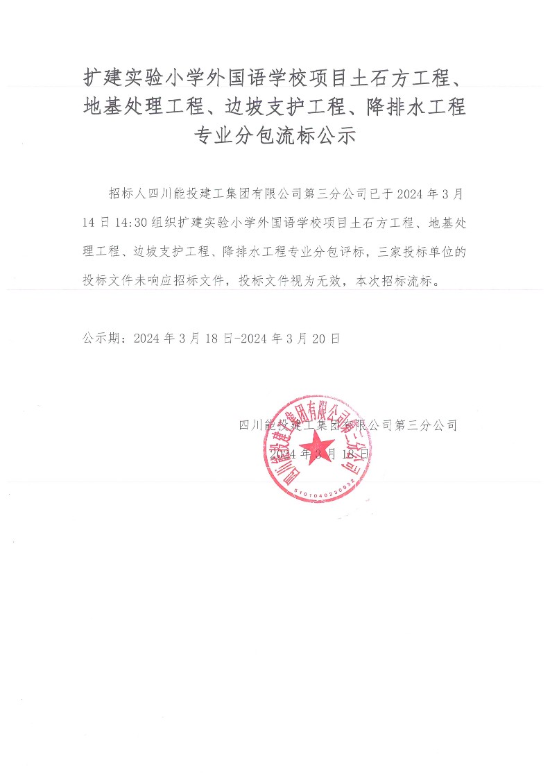 扩建实验小学外国语学校项目土石方工程、地基处理工程、边坡支护工程、降排水工程专业分包流标公示