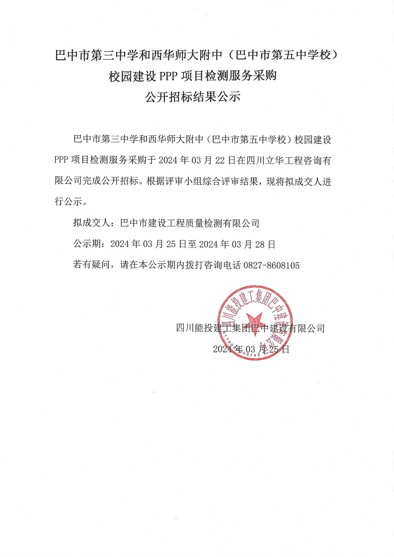 巴中市第三中学和西华师大附中(巴中市第五中学校)校园建设PPP项目检测服务采购结果公示