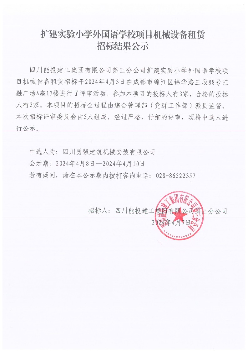 扩建实验小学外国语学校项目机械设备租赁招标结果公示
