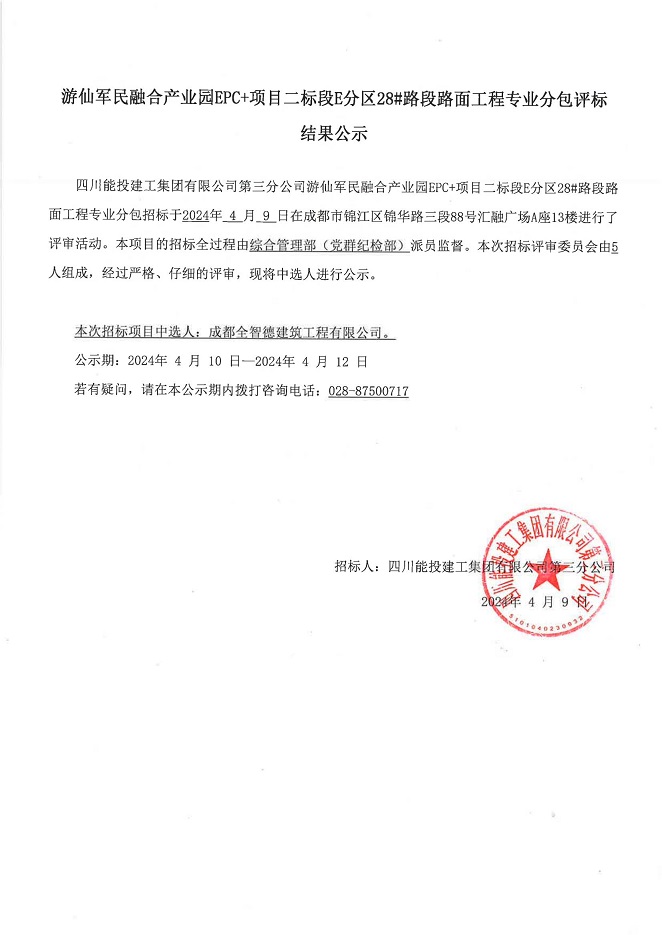 游仙军民融合产业园EPC+项目二标段E分区28#路段路面工程专业分包结果公示