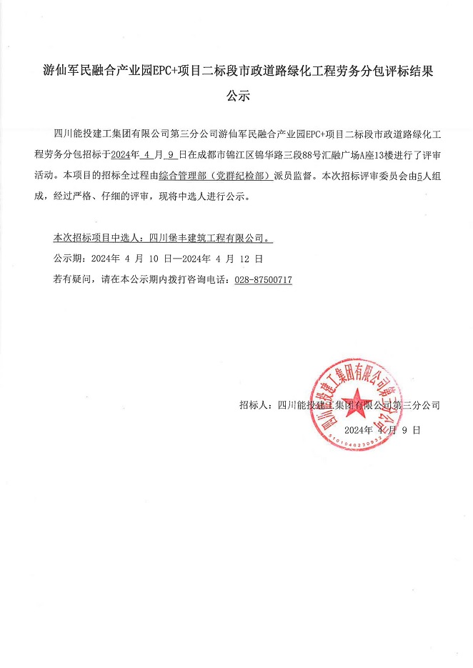 游仙军民融合产业园EPC+项目二标段市政道路绿化工程劳务分包结果公示
