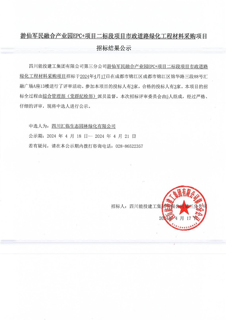 游仙军民融合产业园EPC+项目二标段市政道路绿化工程材料采购项目招标结果公示