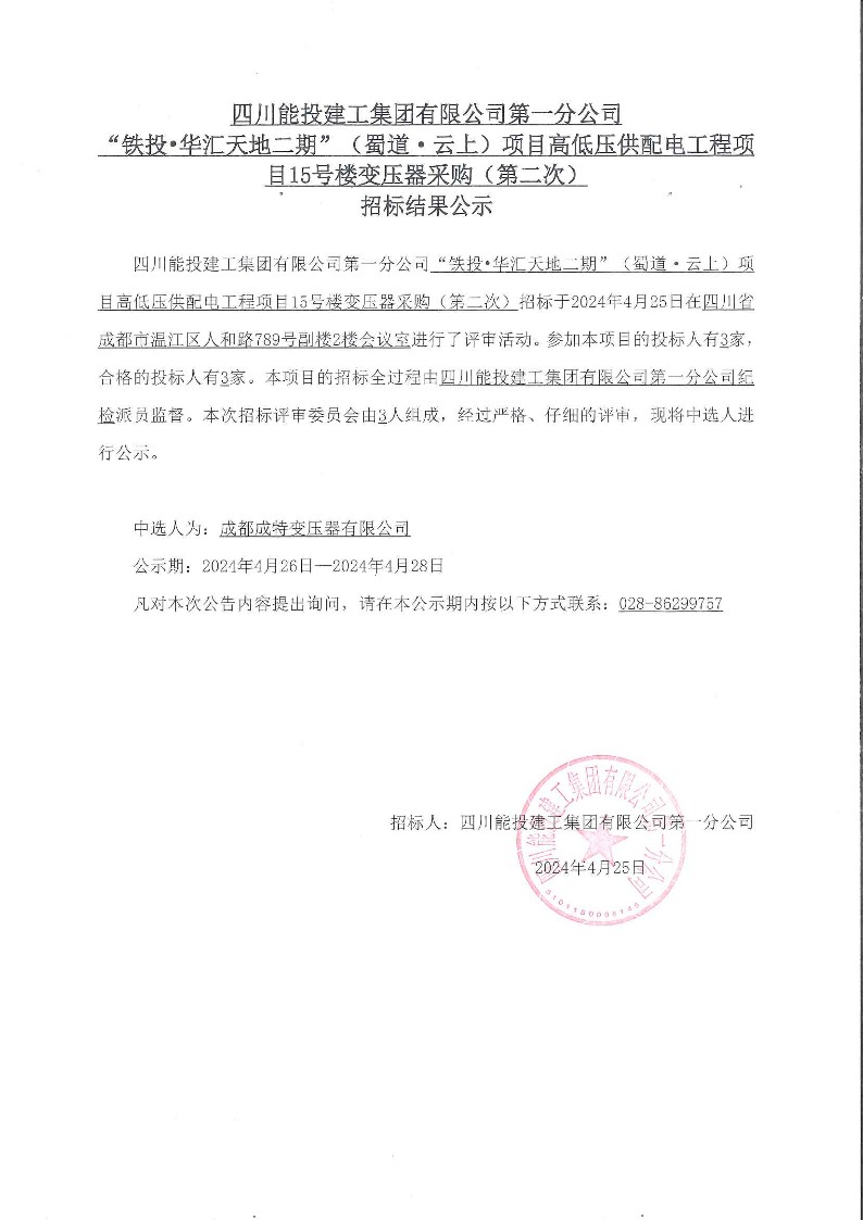 “铁投·华汇天地二期”(蜀道·云上)项目高低压供配电工程项目15号楼变压器采购(第二次)结果公示