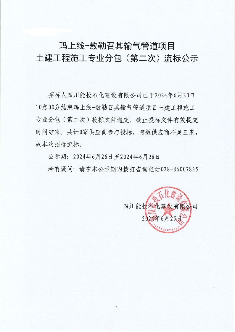 玛上线—敖勒召其输气管道项目土建工程施工专业分包(第二次)流标公示